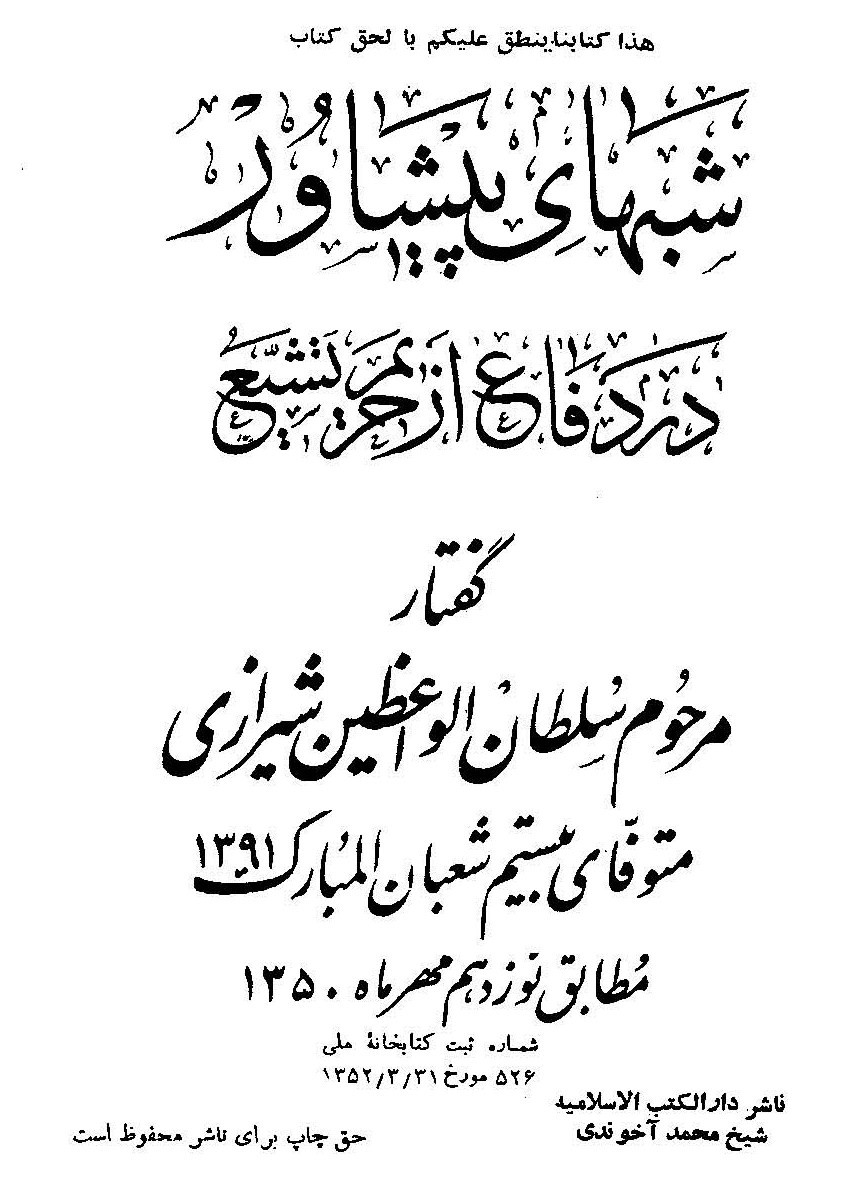که میان مرحوم سلطان الواعظین شیرازی و چند نفر از علمای اهل سنت که در شهر پیشاور پاکستان صورت گرفته است. بعدها سلطان الواعظین آن مناظرات را به رشته تحریر درآورده است.